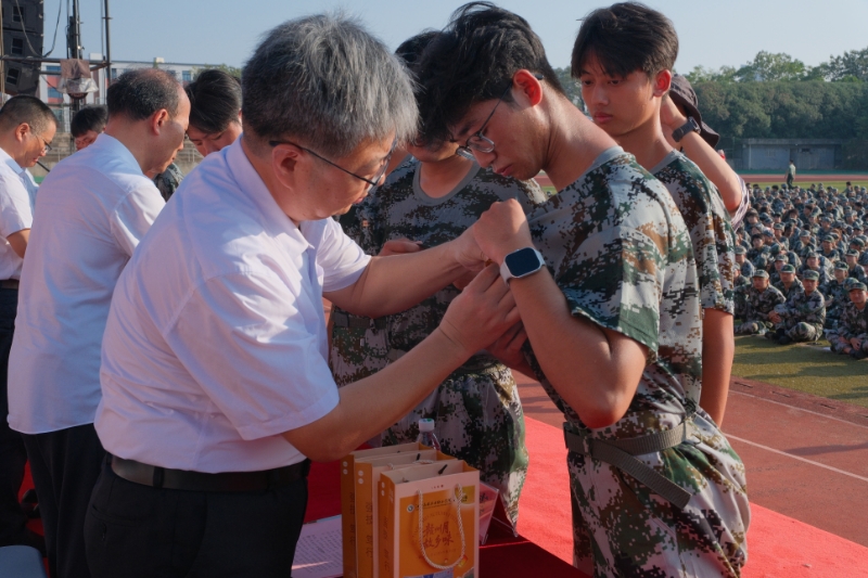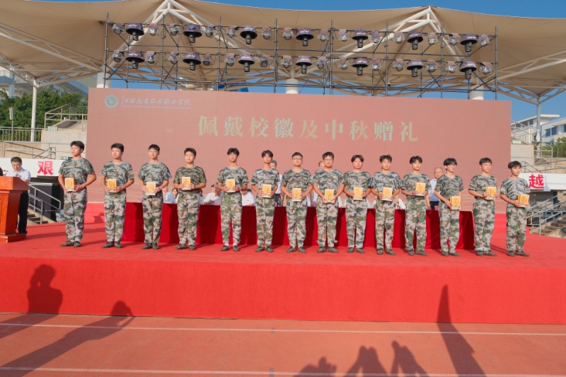 典礼上,学校领导为新生代表佩戴校徽,全场新生集体佩戴校徽,标志着2025级全体新生正式成为学校大家庭的一员。同时,学校领导向新生代表赠送学校定制中秋月饼礼盒,传递了学校对同学们的诚挚关怀与祝福。