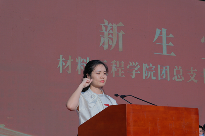 材料工程学院团总支书记梁于青带领全体新生庄严宣誓,铿锵有力的誓言表达了新生们对赓续学校精神的决心与担当。