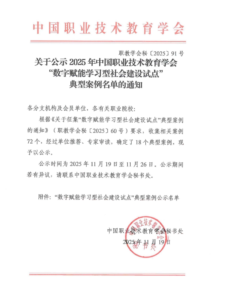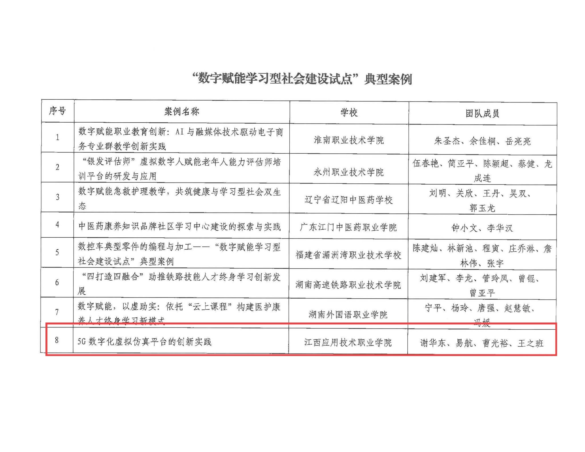 近日,2025年中国职业技术教育学会“数字赋能学习型社会建设试点”典型案例名单公示,经过单位推荐、专家审读,确定了18个典型案例,我校信息工程学院申报的《5G数字化虚拟仿真平台的创新实践》成功入选。