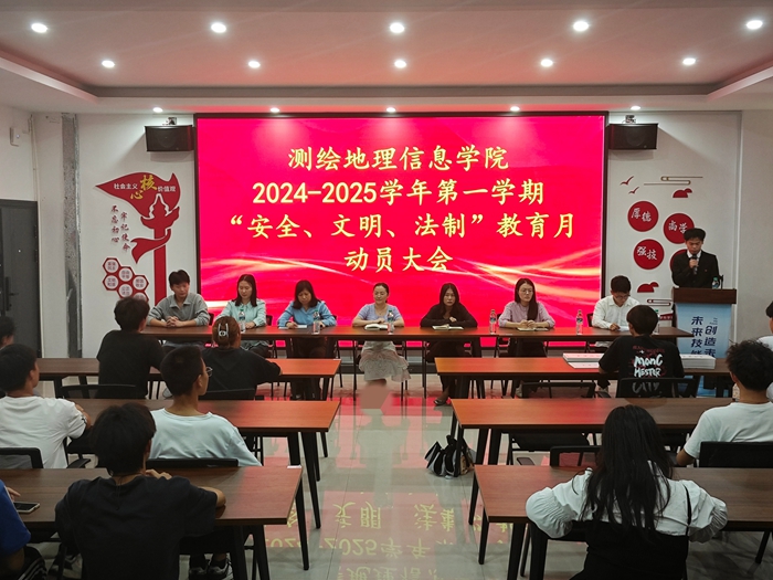 为贯彻落实学校“安全、文明、法制教育月”活动精神,近日,测绘学院先后召开教职工、学生和班级动员大会,全面动员部署。