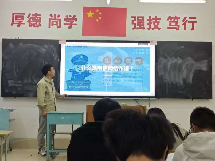 各班主任老师从什么是电信诈骗、电信诈骗的常见形式、如何识别防范电信诈骗、上当后的补救措施四个方面进行深入详细的讲解,让同学们充分了解什么是网络诈骗。其他班主任通过图片、视频、文字等展示当前常见电信诈骗的手段、特点、形式和危害,从冒充QQ好友、盗用微信、网上兼职刷单、游戏充值等具体诈骗手段,结合身边的真实案例对学生进行告诫与提醒,告知学生该如何识别与防范这些诈骗行为;倡导每位学生从我做起,关注防范网络电信诈骗信息,提高防诈骗意识。