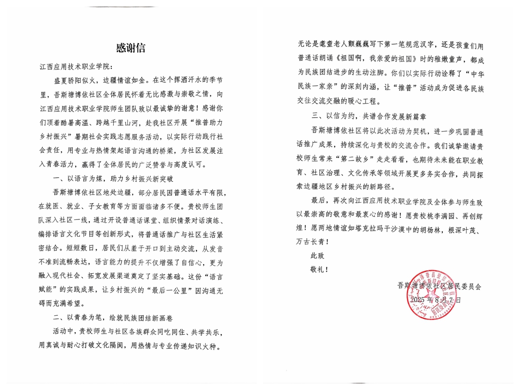 活动期间,实践队与社区共同策划编排语言文化节目等多形式的活动,将普通话推广与社区生活紧密结合。吾斯塘博依社区居委会在给学校发来的感谢信中说:“短短数日,居民们从羞于开口到主动交流,从发音不准到流畅表达,语言能力的提升不仅增强了自信心,更为融入现代社会、拓宽发展渠道奠定了坚实基础”。这份“语言赋能”的实践成果,让乡村振兴的“最后一公里”因沟通无碍而充满希望。