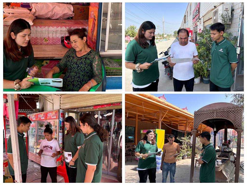 针对社区居民普通话使用需求,实践队深入商户、居民家中,提供“一对一”发音纠正、政策宣讲翻译等服务。团队采用“维吾尔语+普通话”双语情景教学模式,志愿者们带着普通话宣传册、拼音卡片,向沿街商户、居民热情介绍:“叔叔,您看这个‘街’字,拼音是jiē,跟我读一遍吧!”“老板,以后遇到游客,说普通话交流更方便哦!”在菜市场门口,摊主阿依夏木·买买提阿姨笑着接过宣传册:“平时跟老家亲戚打电话说方言,跟顾客就混搭着说,今天才知道‘新鲜’的‘鲜’是xiān,不是xián,多亏你们提醒!”不少居民还主动加入推广队伍,带着孩子一起向邻居示范:“你看,‘谢谢’要说xiè xie,这样更礼貌!”街道上,方言与普通话交织,却因一份共同的热情而格外和谐。