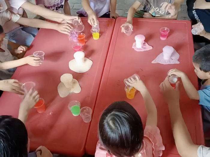 活动伊始,志愿服务队带队老师肖瑶和谢流昌向儿童们分别介绍了本次活动的目的和内容。随后,志愿者们便开始开展一系列的活动。志愿者结合寒假热度极高的《哪吒》电影,以“导游”的身份将电影中出现的场景与地质知识相结合,用生动的语言为孩子们科普地学知识。其中,他通过小苏打与白醋模拟火山喷发实验,详细讲解了岩浆的形成与喷发原理。孩子们踊跃参与互动,在欢乐中解锁地质奥秘。