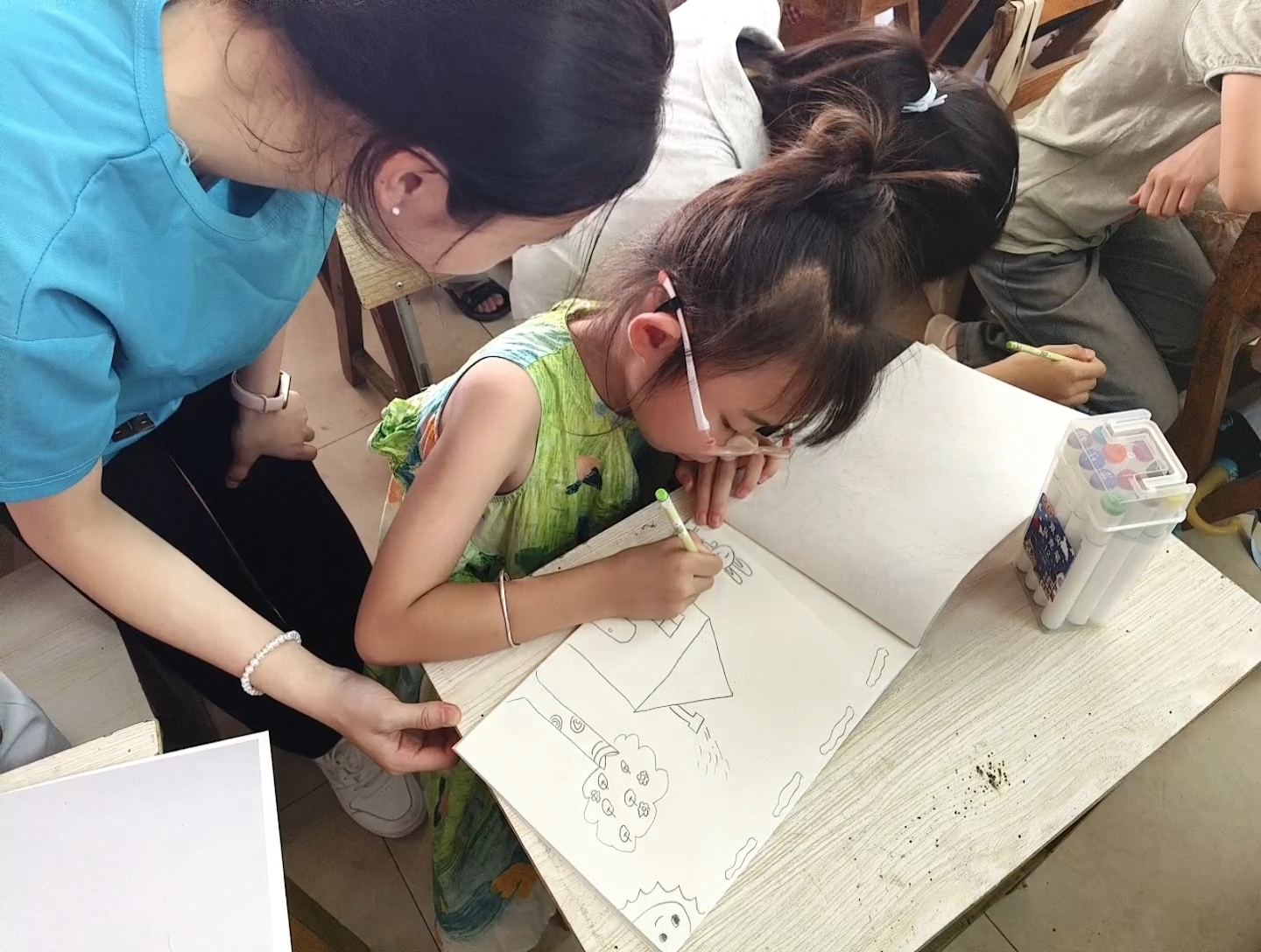 志愿者组织当地学生开展绘图书法创作,以“安全伴我行”“美丽乡村”为主题,引导孩子们用画笔描绘心中的安全愿景,用书法书写对美好生活的向往。孩子们全神贯注,或挥毫泼墨,或精心勾勒,一幅幅充满童趣与创意的作品,展现出乡村少年积极向上的精神风貌,也为新余村增添了浓郁的文化气息。