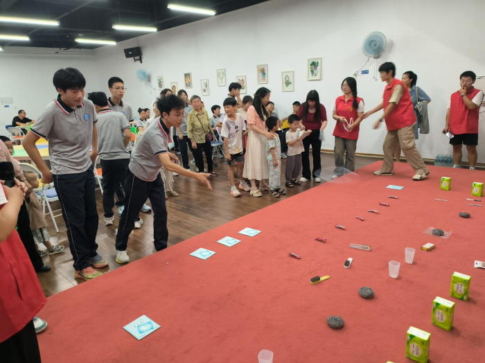 服务队聚焦青少年成长需求,创新设计“暖童心·欢乐套圈”活动。队员们精心布置安全知识趣味赛道,孩子们通过辨识交通标识、回答防溺水要点获取套圈资格,用套中的文具套装等兑换奖品。机电专业学生演示简易电路拼接,指导儿童组装发光手环,在游戏中启蒙科技兴趣。