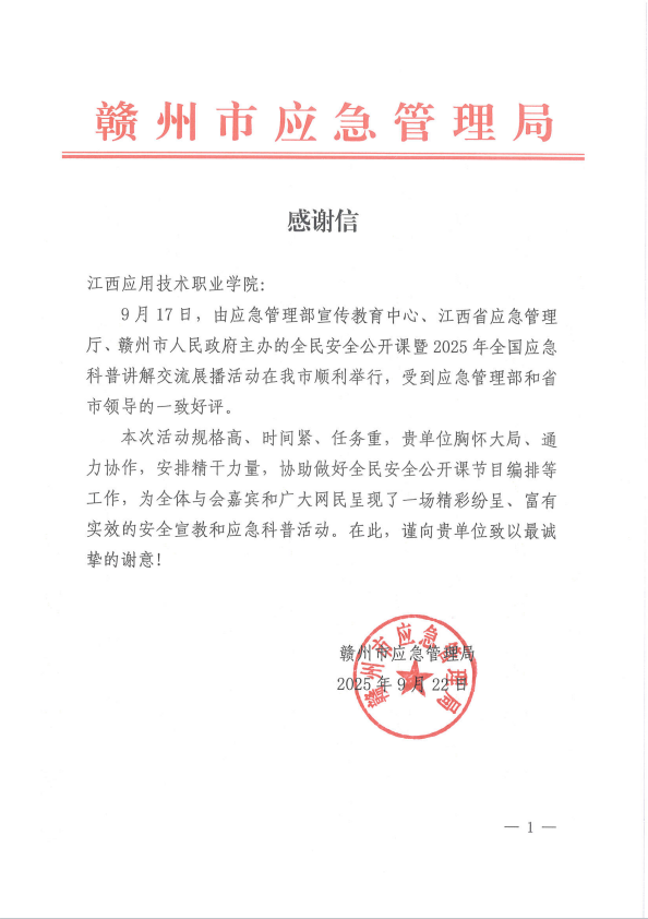 近日,赣州市应急管理局向学校发来一封诚挚的感谢信,对师生在“全民安全公开课暨2025年全国应急科普讲解交流展播活动”中的贡献表示感谢。