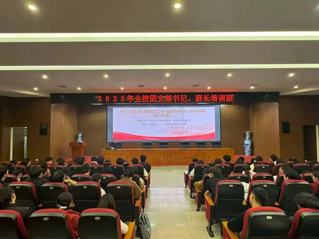 2025年12月3日,2025年全校团支部书记、班长培训班在图书馆报告厅开班。本次培训旨在深入学习贯彻党的二十大四中全会精神,进一步夯实基层团组织建设,提升学生骨干的理论素养、业务能力和责任意识,打造一支政治坚定、能力突出、作风扎实的学生干部队伍。团委书记杨毅兵担任主讲,全校团支部书记、班长出席。