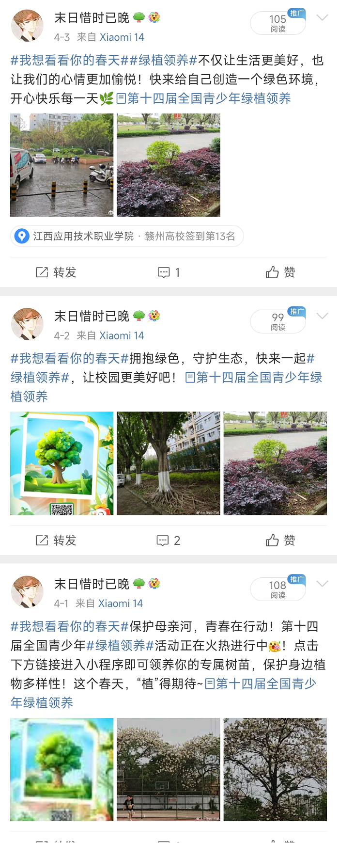 活动期间,同学们利用微博绿植打卡积极互动、转发、参与绿植环保和云养树相关话题,开展了不少于7天的校园植物随手拍活动,并通过小程序智能识别校园植物,建立校园植物图谱。各班团支部组织学生在世界森林日、世界地球日、国际生物多样性日通过“绿植领养”小程序观看主题团课,提升环保意识。