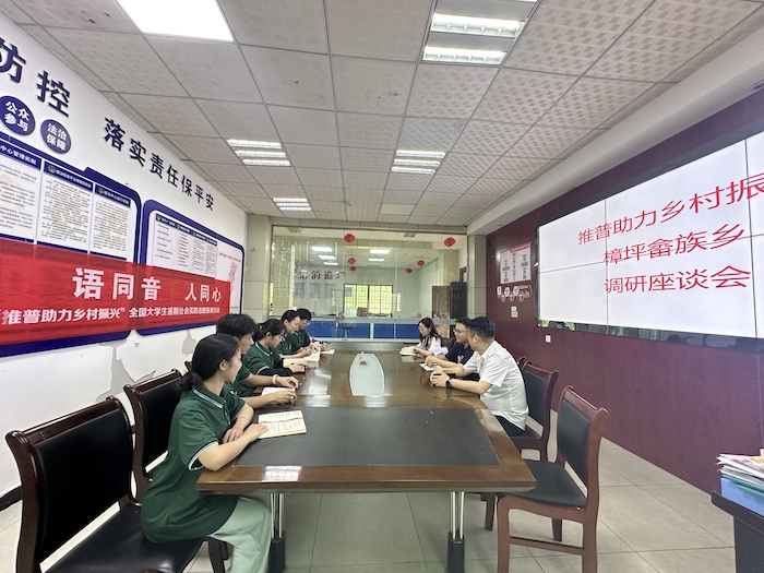 社会实践团队抵达当天,便与贵溪樟坪畲族乡工作人员开展座谈会,进行深入地交流与沟通。通过座谈会,团队了解到江西省鹰潭市贵溪樟坪畲族乡成立于1963年,是江西省三个畲族乡之一,畲族常住人口200余人,居住地较分散,普通话在村中有一定的普及程度,发音不准、发音混淆与乡音浓厚等问题仍然存在,普通话整体普及率仍有较大的提升空间。基于调研座谈结果,团队调整活动方案,增加更具针对性的普通话推广活动,包括普通话培训课程、文化交流活动等,旨在提高当地居民的语言能力,促进语言文化的交流与融合。