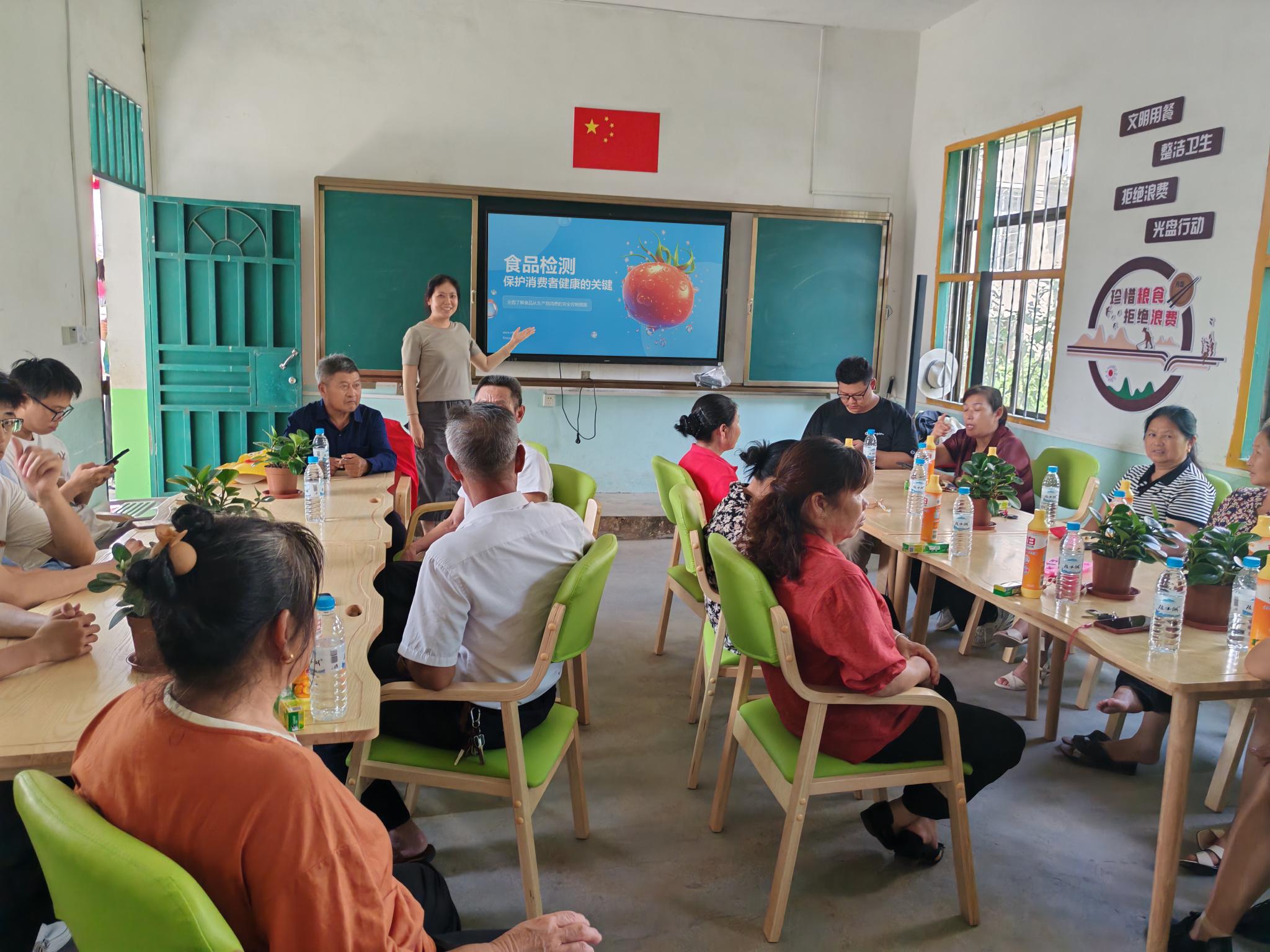 材料工程学院绿松石志愿服务队前往大余县东山村新时代文明实践中心通过讲解食品安全的定义,列举分析食品安全谣言案例,增强了居民对食品安全的认知,弘扬了节约粮食的美德。志愿者们通过介绍食品检测的四大类指标,以及如何正确挑选健康食品提供了全方位的指导,让村民在面对琳琅满目的食品时能游刃有余地选择。培训结束后,为更好地向村民科普相关知识,绿松石志愿服务队的同学们给村民分发了食品安全宣传手册。对于一些听力不好的老人,其他队员们也都俯身倾耳,向他们讲解宣传单上的知识。