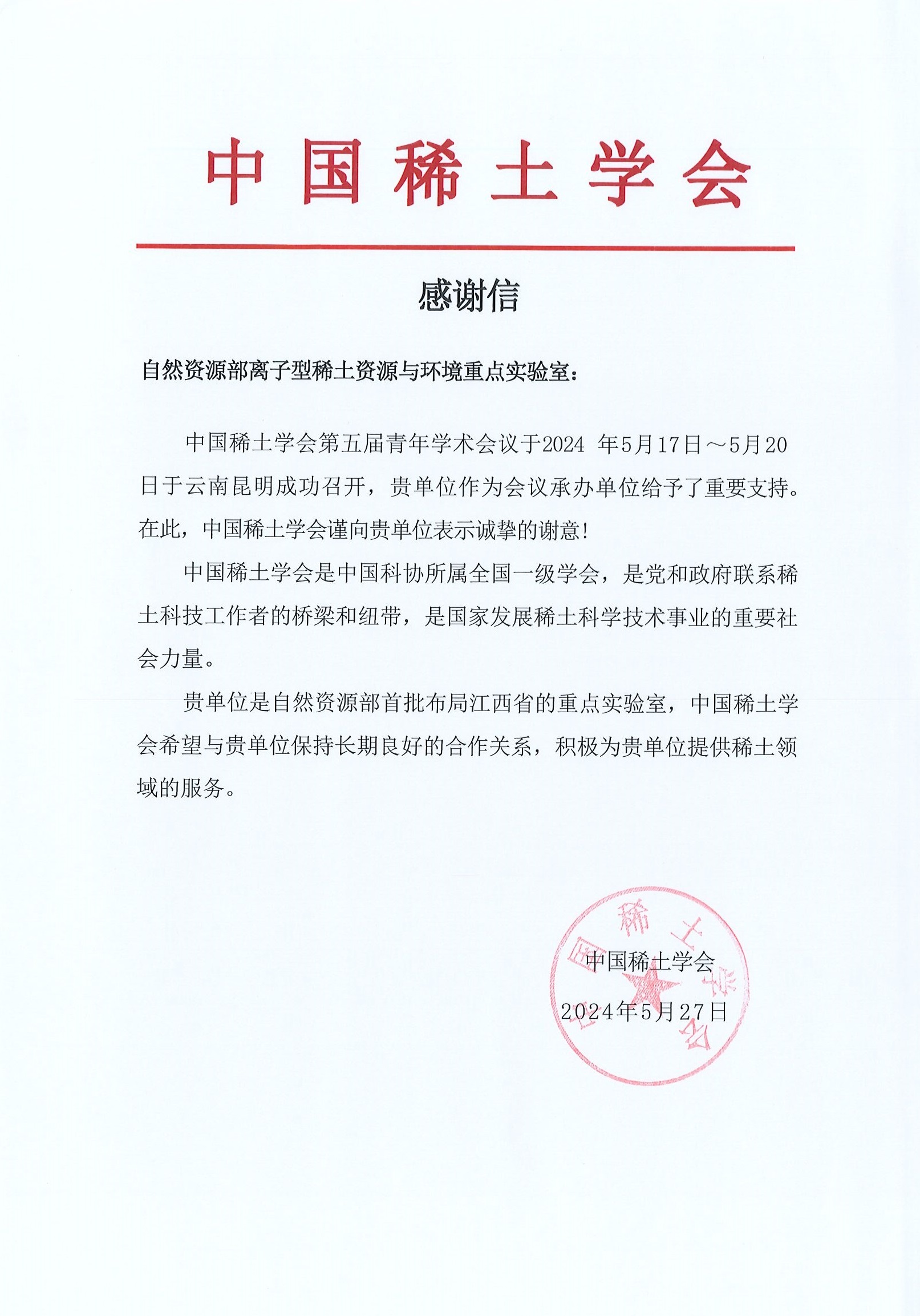 近日,中国稀土学会为我校送来感谢信,感谢我校自然资源部离子型稀土资源与环境重点实验室作为“中国稀土学会第五届青年学术会议”承办单位给予的大力支持。信件不仅体现了我校与中国稀土学会之间的紧密合作关系,更肯定了我校在中国稀土研究领域的卓越贡献。