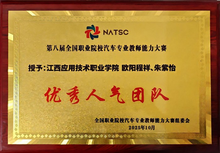 10月24日上午,第八届全国职业院校汽车专业教师能力大赛总决赛在重庆科学会堂圆满闭幕。来自全国职业院校各赛项荣获金奖的33支参赛队汇聚全国总决赛,展开同场竞技,以教学能力为核心,全方位考察教师综合素养。经过为期两天的激烈角逐,我校汽车学院教师欧阳程祥、朱紫怡凭借出色表现,荣获总决赛“最佳职业素养奖”专项奖和“优秀人气团队”奖项。
