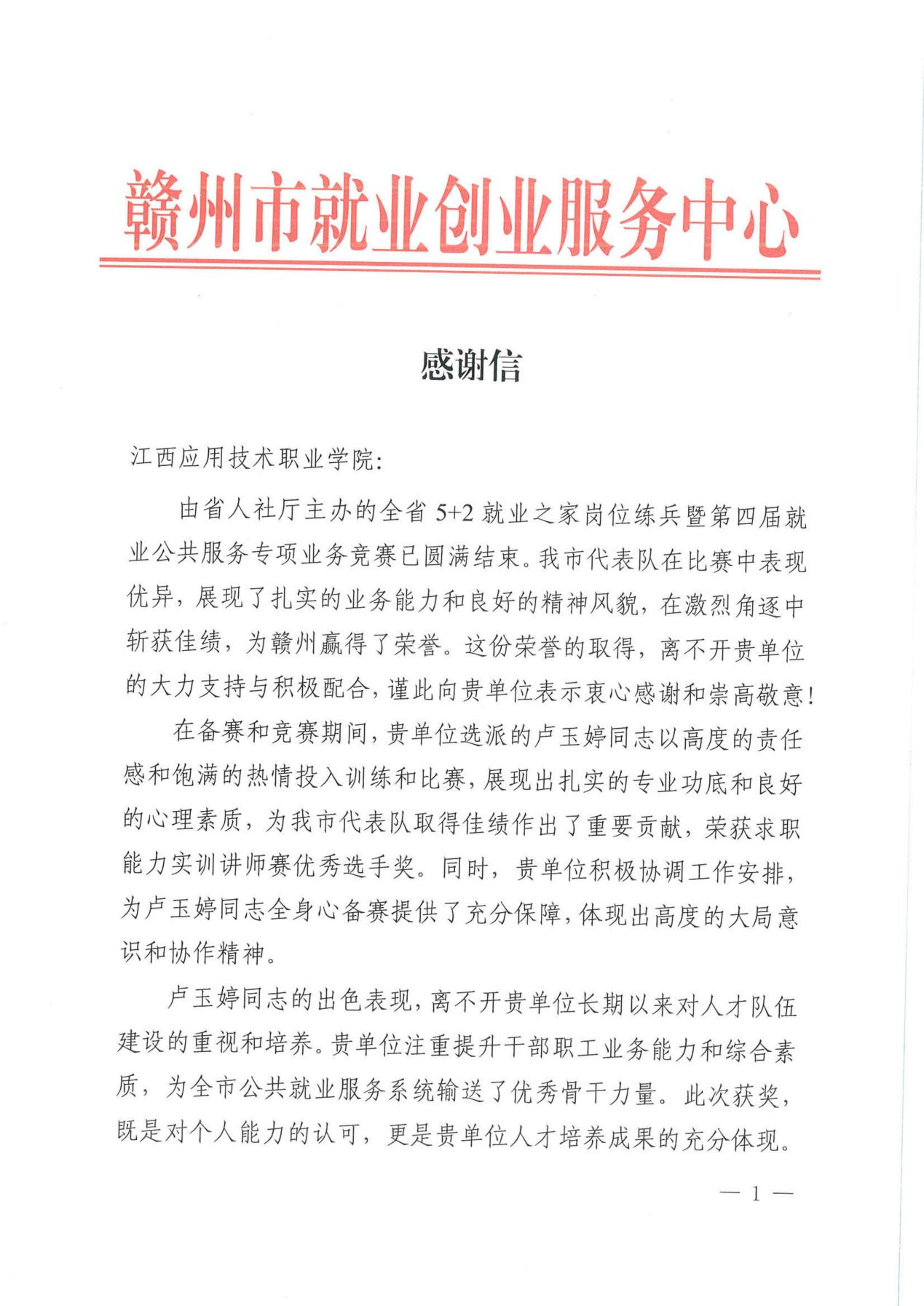 11月6日,赣州市就业创业服务中心专门向学校发来感谢信,对卢玉婷同志在竞赛中的出色表现给予高度评价,赞其为赣州代表队取得佳绩作出重要贡献。信中同时感谢我校长期以来对人才队伍建设的重视和培养,为全市公共就业服务系统输送了大批优秀骨干力量,为推动区域就业创业工作高质量发展提供了坚实支撑。
