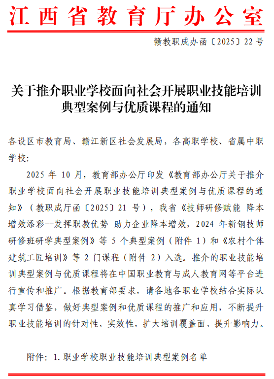 近日,江西省教育厅办公厅印发《关于推介职业学校面向社会开展职业技能培训典型案例与优质课程的通知》,我校建筑学院的《农村个体建筑工匠培训》课程成功入选优质课程,成为江西省此次入选的两门优质课程之一。推介的优质课程将在中国职业教育与成人教育网等平台推广和应用。这一荣誉的获得,是教育部对我校职业技能培训工作专业性、实效性的高度认可,更是学校深耕“职教服务社会”领域、助力乡村振兴战略的重要成果。