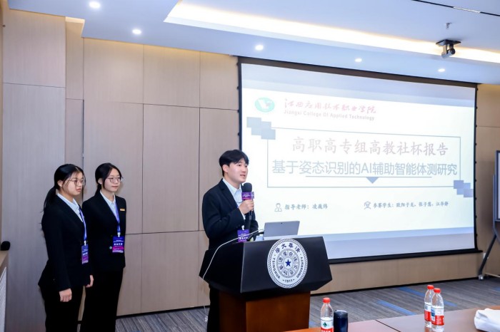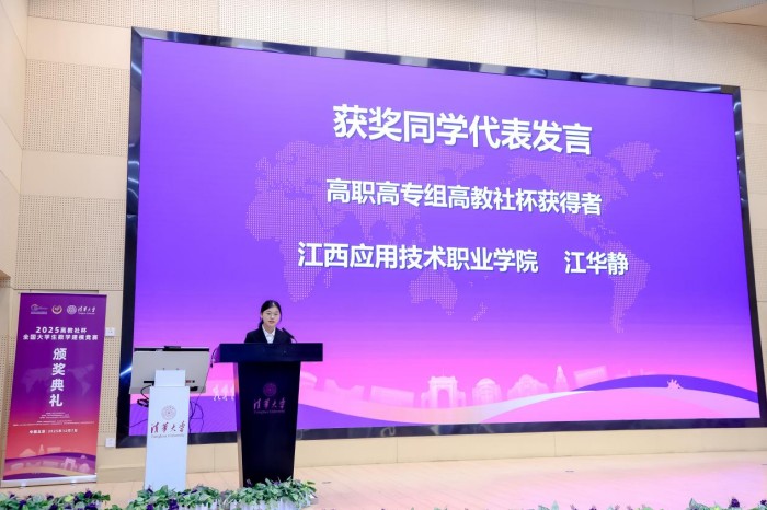 荣耀不仅在于捧杯。在颁奖典礼前的学术报告环节,我校最高奖团队以《基于姿态识别的AI辅助智能体测研究》为题,在清华大学的讲台上展示了扎实的研究成果与敏捷的思辨能力,其报告内容新颖、逻辑清晰,充分彰显了我校学子的专业素养与创新活力,收获了与会代表们的广泛好评。更令人骄傲的是,在颁奖大会上,江华静同学作为全国高职高专组所有获奖学生中的唯一代表登台发言。她声情并茂地分享了参与数学建模竞赛的心路历程、收获感悟,生动诠释了我校学子薪火相传的数模精神。