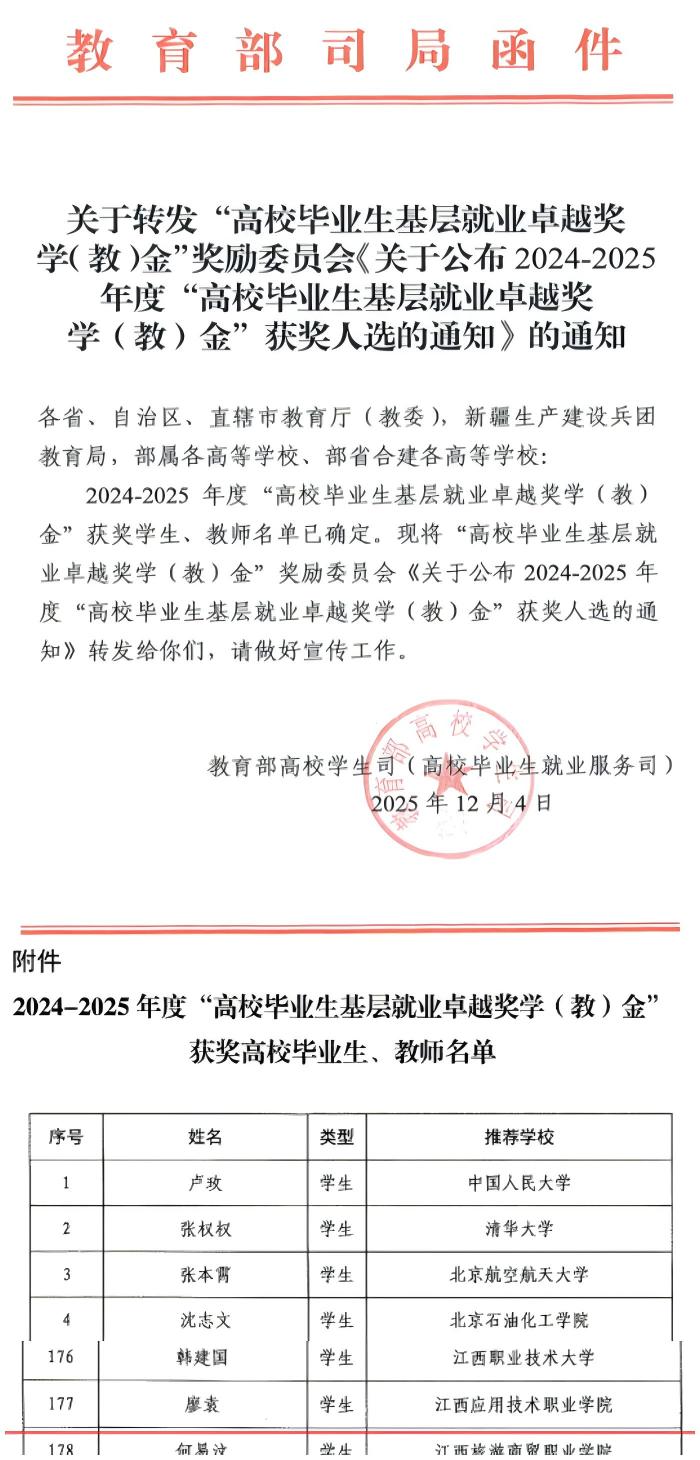“全国高校毕业生基层就业卓越奖”由教育部相关部门指导,中国教育发展基金会设立,旨在表彰基层就业表现突出的高校毕业生及相关教师,是鼓励青年投身基层建设的重要国家级荣誉。我校毕业生连续三年获此殊荣,生动展现了一届届应用学子将个人理想融入国家发展、在基层一线砥砺奋斗的青春风采。
