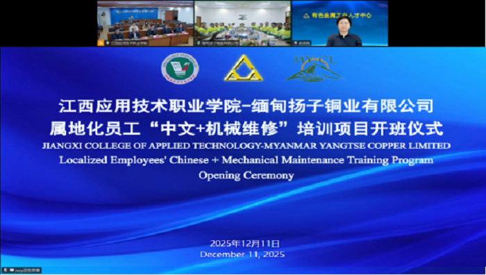 12月11日,由有色金属工业人才中心指导、我校承办的缅甸扬子铜业有限公司属地化员工“中文+机械维修”培训项目顺利开班。有色金属工业人才中心主任助理、教育培训处处长赵丽霞,学校党委副书记、校长杨潮兴,万宝矿产有限公司副总经理周斌出席并致辞。仪式由党委委员、副校长曾毅主持。缅甸扬子铜业有限公司副总经理张罗虎,公司人事部、维修部、重修部、工艺部、采矿部等相关部门负责人与29名参训学员,我校产教融合中心、机电学院和社会学院负责人等以线上与线下结合的方式参加开班仪式。