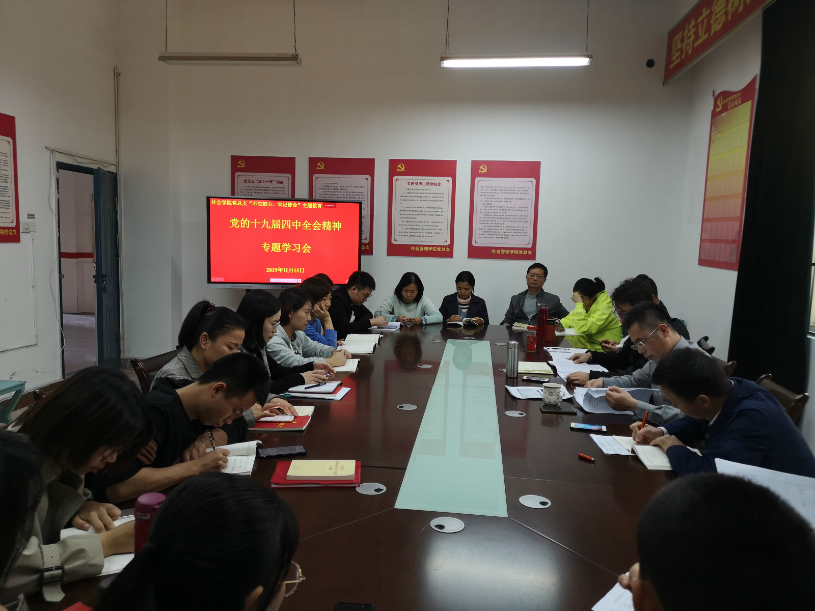 11月15日下午,社会管理学院党总支在西实训楼1103会议室召开党的十九届四中全会精神专题学习会。会议由党总支副书记何希纯主持,社会管理学院全体党员参会。