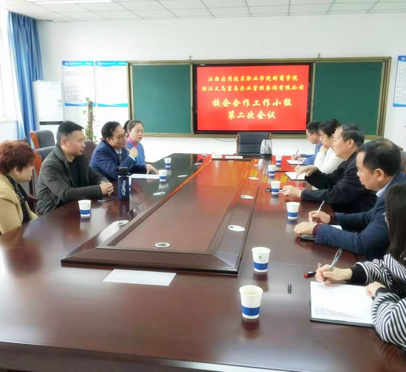 2020年1月7日,财商学院与义乌富高企业管理咨询有限公司在西实训楼五楼会议室召开校企合作工作小组第二次会议,财商学院院长张凤玉、副院长许晓东,党总支副书记何萍、商务教研室主任万小毛以及专业教师吴文雅、办公室主任李姿丽、实训中心赖昌美,义乌富高企业管理咨询有限公司邹丰等团队4人参加会议。