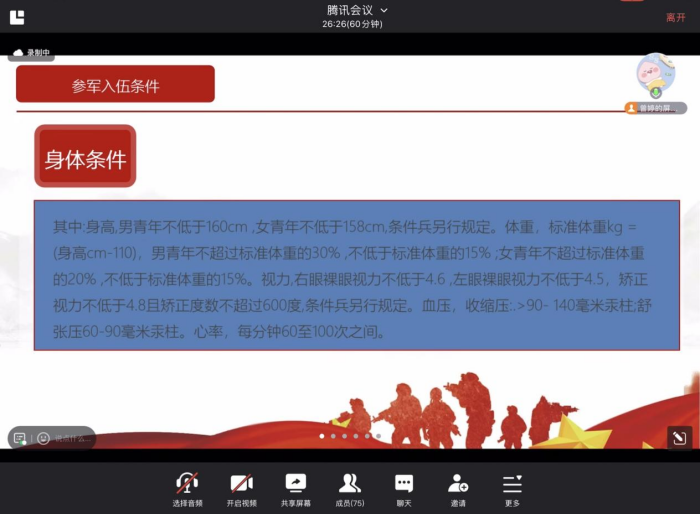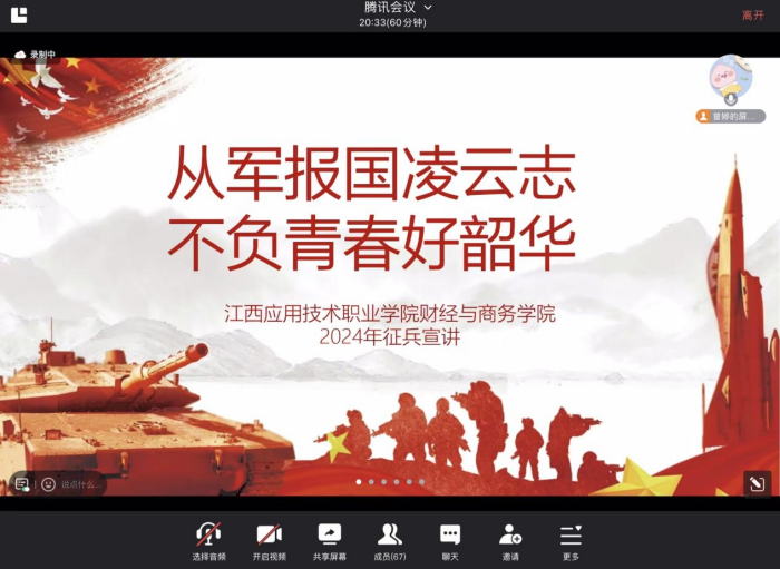 2023年12月,财商学院各班班主任积极在线上线下开展2024年春季征兵宣传工作,取得了良好的效果,陆续有学生来咨询相关政策,积极参与网上报名。1月20日,财商学院辅导员曾婷老师利用腾讯会议面向2024届毕业生进行宣讲,主要围绕参军的意义、参军入伍和条件、参军报名的基本流程和参军享有的优待政策四个方面进行了解读和宣传,部分有意向参军入伍的同学参与了此次宣讲。