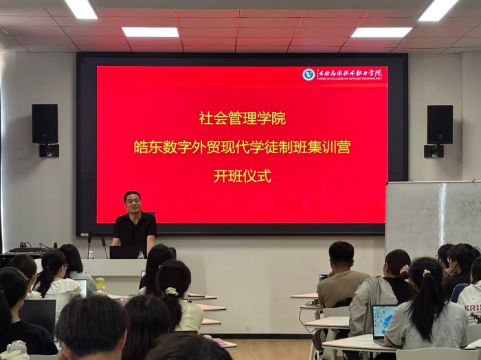 近日,社会管理学院商务英语教研室与江西皓东科技有限公司校企合作项目——“皓东数字外贸现代学徒制班集训营”开班仪式在8栋505教室隆重举行。江西皓东科技有限公司总经理沈春林,我校社会管理学院商务英语教研室主任罗海琳出席仪式并致辞,23级商务英语专业数字外贸现代学徒制班学生参加了本次开班仪式。
