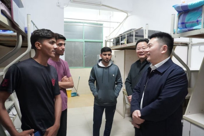 走访交流中,李和杰与留学生们促膝长谈,耐心询问大家在住宿环境、饮食口味等方面的适应情况,细致解答同学们关于课程设置、校园服务的疑问。他勉励同学们珍惜来之不易的留学契机,既要深耕专业知识,夯实学术基础,也要主动沉浸式体验中国文化,感受中华优秀传统文化与现代社会的独特魅力,争做中国故事、应用故事的积极传播者,用青春力量赓续中巴两国的深厚友谊。谢宇飞则鼓励同学们尽快融入校园生活,积极参与各类学生活动与跨文化交流项目,在求学之路上不仅收获知识与成长,更能成为连接中巴文化的友好使者,拓宽国际视野,缔结真挚情谊。