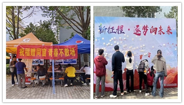 墨魂书画国学社、声乐与器乐协会联合开展的“祝福赠同窗 青春不散场”活动,为同学们提供了一个表达情感、留下美好回忆的温馨空间。活动在一食堂主干道前的精心布置了祝福墙,师生们纷纷拿起笔,伴随着充满情谊的歌声,在展板上留下不舍与憧憬。一句句真挚的话语贴满祝福墙,构成了一幅满载情谊的青春画卷。