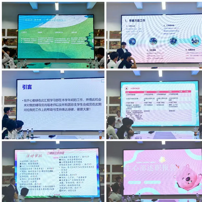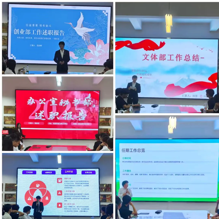 学院团总支学生会11个部门负责人分别进行了部门工作述职。他们阐述了本部门在年度工作中的具体举措、创新亮点与成员成长,分享了工作中的经验与感悟。