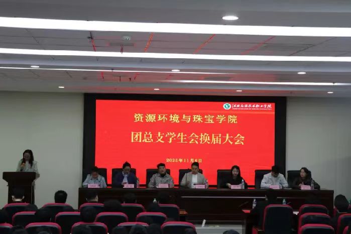 为总结学院团总支学生会过往工作成果,提升组织活力,更好地服务师生与学院发展,资源环境与珠宝学院于11月6日晚在11栋401教室成功召开2025年团总支学生会换届大会。资源环境与珠宝学院党总支副书记朱春福、校学生会秘书长陈妍、学院老师郑远亮、谢流昌、肖阳、刘玉和余杨婧受邀出席,团总支学生会成员及部分学生参加,现场氛围庄重而热烈。本次大会由资源环境与珠宝学院老师肖瑶主持。