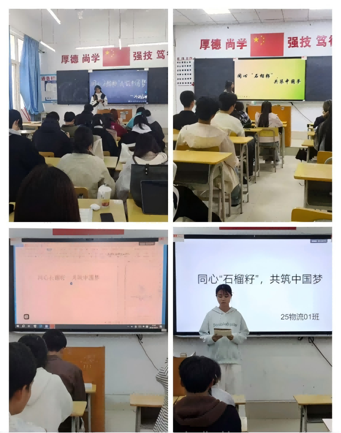 各班级组织开展“同心‘石榴籽’・共筑中国梦” 主题班会。各班级通过播放民族团结、共同发展的宣传片,生动展示了我国各民族在历史长河中相互依存、守望相助的动人场景和在党的领导下各民族取得的辉煌成就,各民族像石榴籽一样紧紧相拥的画面,让同学们深受触动。在互动环节,同学们积极探讨了解不同民族的特色服饰、传统节日、饮食文化和民俗风情等民族文化,现场气氛热烈。大家在交流中增进了对不同民族文化的了解与尊重,进一步拉近了彼此的距离。
