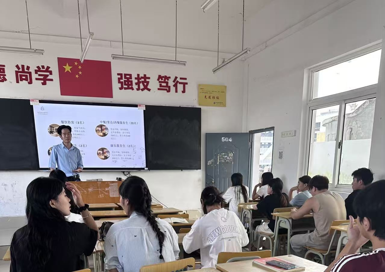 宣讲会上,肖经理系统介绍了酒店的发展历程、核心业务与企业文化,并结合实际案例,深入解读了当前酒店行业的发展趋势与就业前景。围绕财经与商务学院的专业特色,他重点讲解了前厅接待、餐饮服务、客房服务等热门岗位的职责要求,并详细阐述了企业“阶梯式成长计划”与职业晋升通道,帮助学生清晰认知岗位需求与专业学习的契合点。