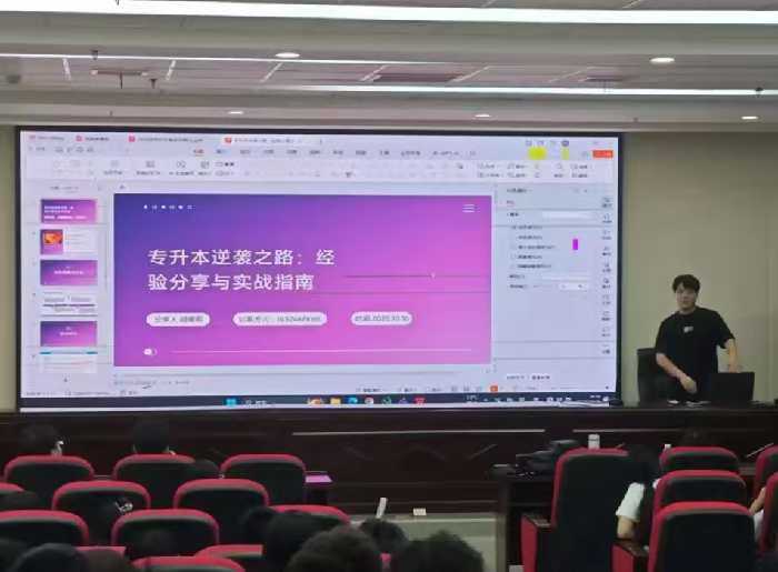 讲座现场,帅志浩与胡康熙结合自身备考心得与考后规划经验,为同学们分享了宝贵的经验。他们系统解读了专升本政策要点,详细介绍了高效备考策略与心态调整方法。现场互动气氛热烈,同学们积极提问,针对“如何平衡实习与备考”“跨专业报考注意事项”等问题逐一解答,让大家对专升本备考有了更清晰的认识。