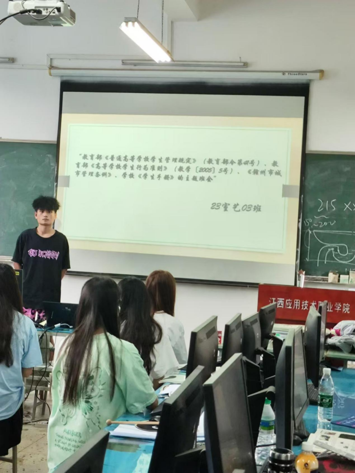 为切实加强学生安全意识,帮助学生了解和遵守法律及校规,确保校园和谐稳定,保障学校正常的教育教学秩序,设计工程学院于10月15日开展以学习教育部《普通高等学校学生管理规定》《高等学校学生行为准则》《赣州市城市管理条例》和《学生手册》等“国家法律法规和学校规章制度”为主题的班会。