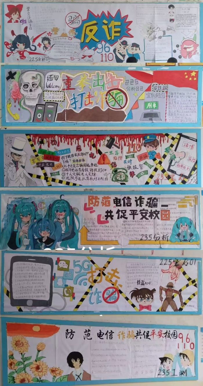 10月28日,组织开展“防范电信诈骗,共筑平安校园”主题墙报设计大赛。各班级积极响应,以醒目的字体、图示和配色吸引了同学们的目光,将各种诈骗的方式以及真实诈骗案例用墙报的形式展示,生动有趣地向师生们普及了校园网络电信诈骗知识,提高师生们的防诈意识。