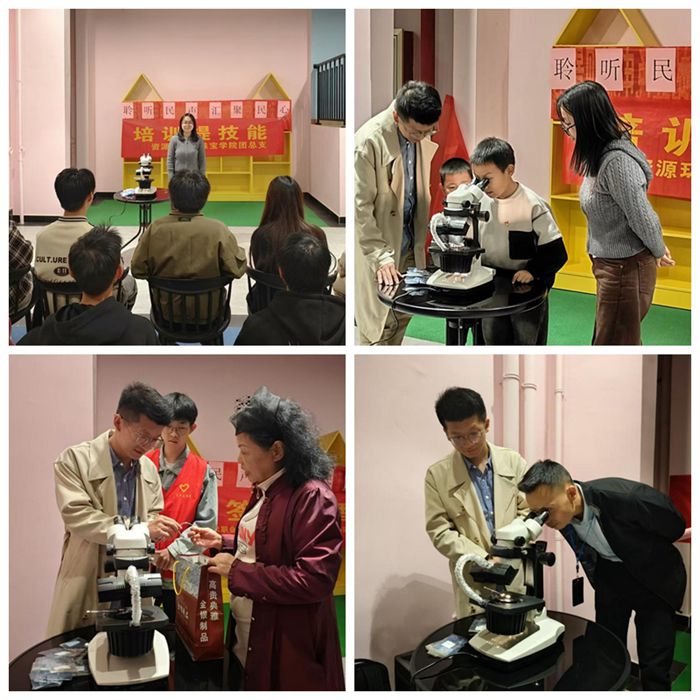 随后学院专任老师李荣深入浅出地从专业角度介绍了这些宝玉石的种类、特点、鉴别方法以及保养技巧。在互动环节中,居民们积极参与,通过显微镜实际观察宝玉石标本,更加直观地了解了宝玉石的特征。现场李荣耐心地解答着居民们的问题,气氛十分活跃。