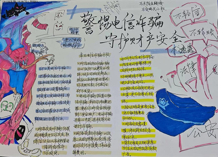 此次“防范电信网络诈骗”手抄报比赛,增强学生防范电信网络诈骗的意识,提高学生对电信网络诈骗的手段和形式的认识,时刻保持警惕,避免上当受骗,共同营造一个安全、和谐的校园环境。