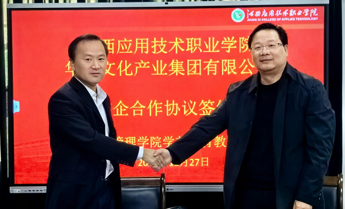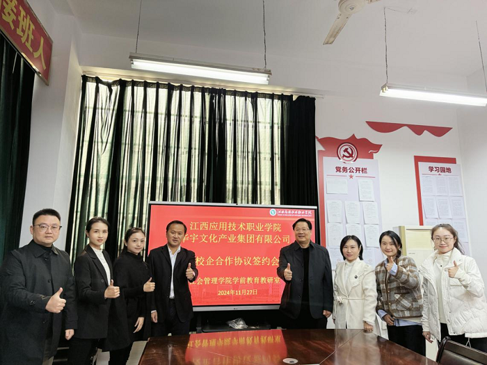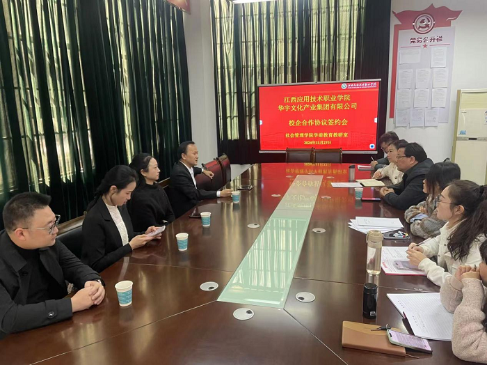 11月27日上午,学校与赣州华宇文化产业集团有限公司校企合作签约仪式在西实训楼1103会议室举行。社会管理学院院长李和杰、赣州华宇文化产业集团有限公司董事长刘宇飞出席仪式。社会管理学院学前教研室教师代表参加,签约仪式由社会管理学院学前教研室负责人陈钟主持。