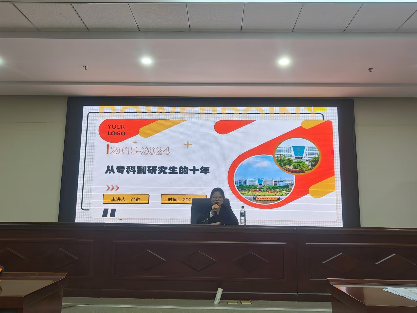 严静回顾了在母校学习的青春岁月,在职场奋斗的时光和辞职考研的艰辛历程,围绕大专岁月、职场生涯、自考征途、考研征程四个阶段分享了自己一路披荆斩棘从专科生到研究生的心路历程,以自己的亲身经历鼓舞学弟学妹们要敢于有梦、勇于追梦、勤于圆梦,勉励学弟学妹们要学会肯定自己、不要因害怕而放弃、要勇敢的跳出舒适圈、永远心怀感恩,以后的日子要去多长点本事,多看世界,多走些路,把时间花在正事上。严静还分享了求职经验和备考经验,为学弟学妹们求职和提升学历提供了指导。最后,严静对学弟学妹们提出的是否应报考计算机二级和如何提升学历等问题进行了答疑解惑,现场氛围热烈。