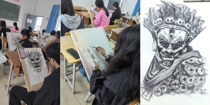 在美术基础教学中融入傩戏元素,此举不仅实现了文化传承,同时也锻炼了学生的创新能力。与传统美术基础课程相较之下,引入傩戏面具展现出更显著的艺术张力和广阔的表现空间。同学们将古老的傩戏元素融入画笔之间,用细腻的线条和丰富的色彩,勾勒出一个个神秘而庄重的傩戏场景。这些作品不仅是对宁都非遗文化的深情致敬,更是对传统文化的一次生动诠释。