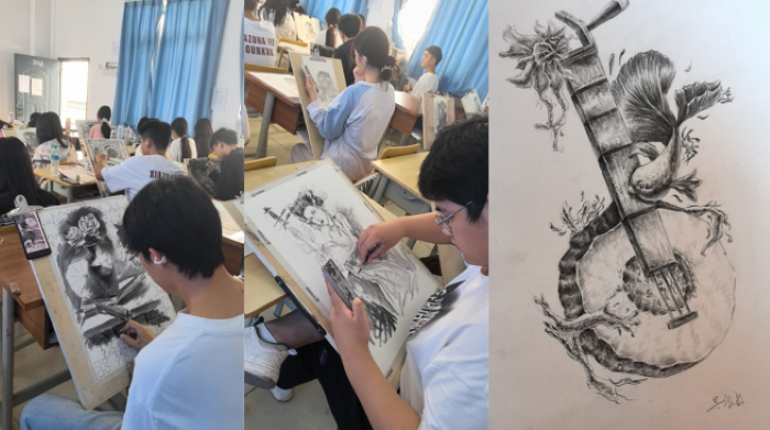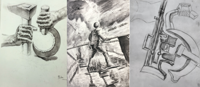 此外,红色党史题材的设计素描作品也是美术基础课程的一个提升教学质量的探索。同学们在学习党史故事的同时以独特的视角和个人的理解,将党的光辉历程和伟大成就凝聚在画布之上。每一幅作品是同学们用艺术的手法,再现个人对党史故事的感受。(例如:李灿创作的工农力量、邓祖江创作的飞夺泸定桥)让人在欣赏艺术的同时,也能感受到党的伟大和历史的厚重。