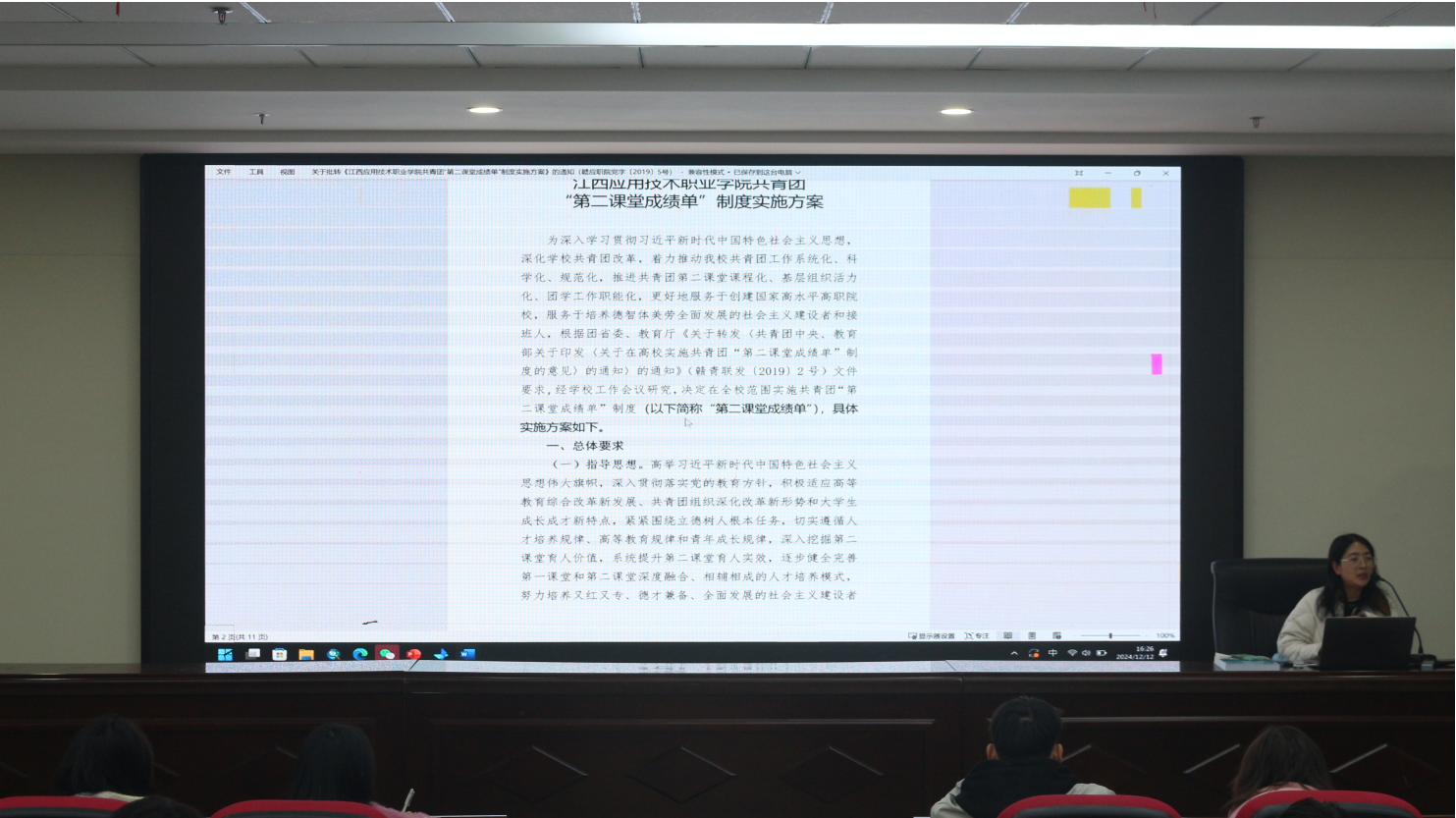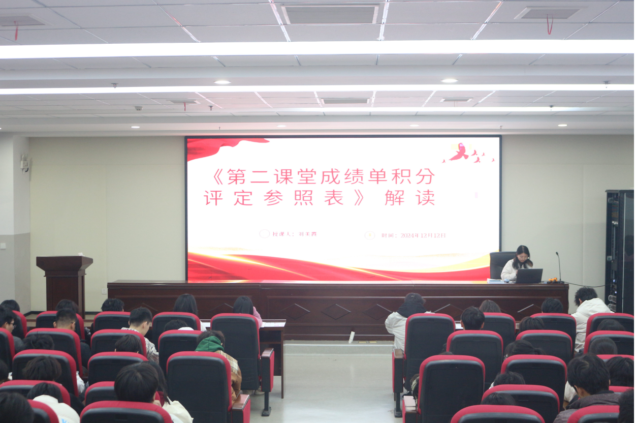 为进一步提升学生干部的业务素质和能力,打造一支精干、高效有特色的团学干部队伍,12月12日下午,学校团委于11栋401教室开展《第二课堂成绩单积分评定表参照表》解读主题讲座,讲座由校团委老师刘美霞担任主讲。