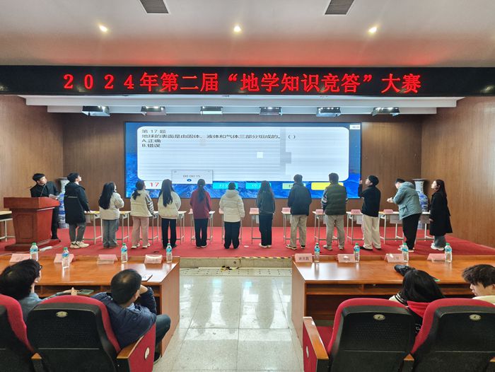 为深入普及地球科学知识,激发同学们对地球科学的兴趣,12月12日晚,由资环学院主办,地学科普协会承办的2024年地学知识竞答大赛决赛在图书馆一楼学术报告厅举行。本次大赛分为初赛(笔试)和决赛(现场答题)两个环节。参赛的队伍来自学校各二级学院,进入决赛的队伍有12支。现场150余名同学观摩了本次决赛。