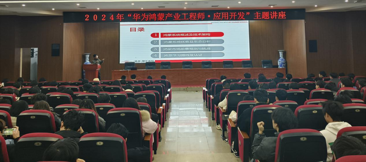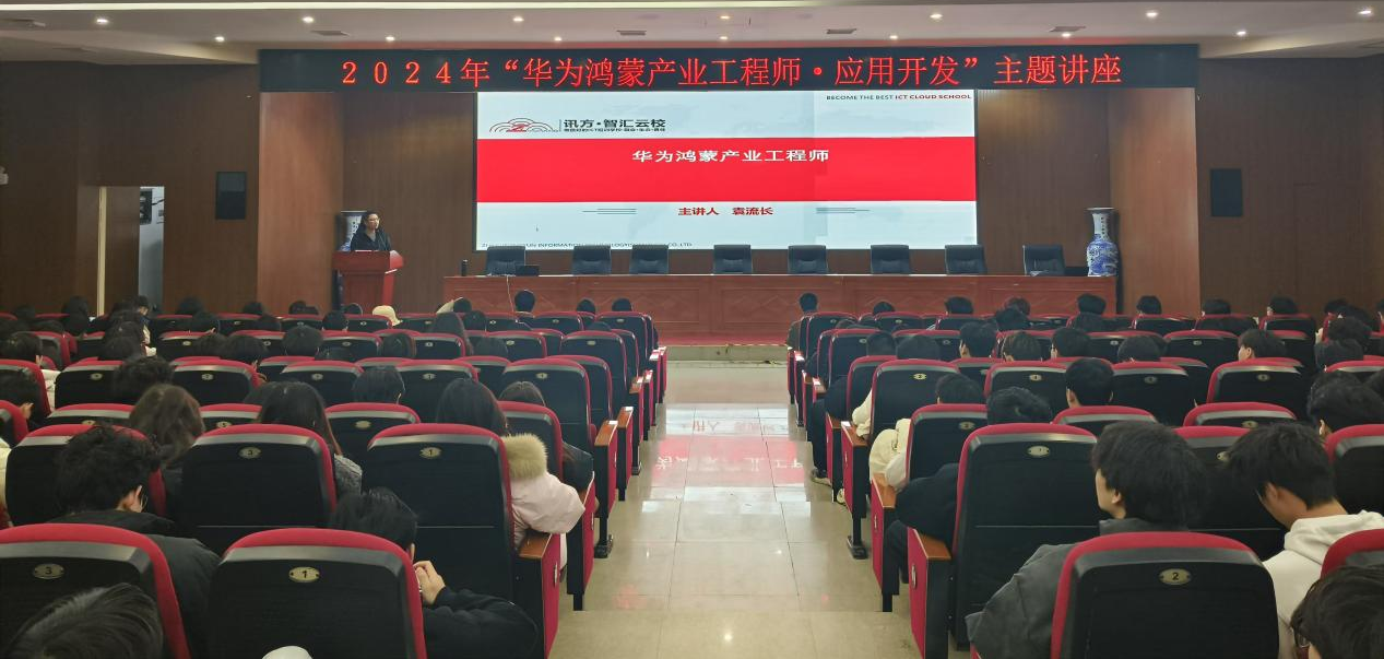 12月19日,信息工程学院与深圳市讯方技术股份有限公司(简称“讯方技术”)在图书馆报告厅举办“华为鸿蒙产业工程师·应用开发”主题讲座。信息工程学院教师谭志刚、曾俊,讯方技术运营经理叶荣杰,讯方技术高级讲师袁流长以及信息工程学院300名同学参加讲座。主题讲座由讯方技术高级讲师袁流长担任主讲嘉宾,进行精彩的主题分享。