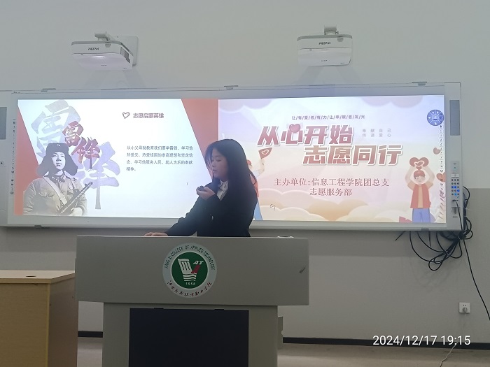 为彰显优良品德,展示信息工程学院文明向上的精神风貌,增强学生的奉献精神。12月17日晚,信息工程学院在11栋103举办“志愿在身边”创意展示活动,12名学生参赛,各学院80余名同学观赛。