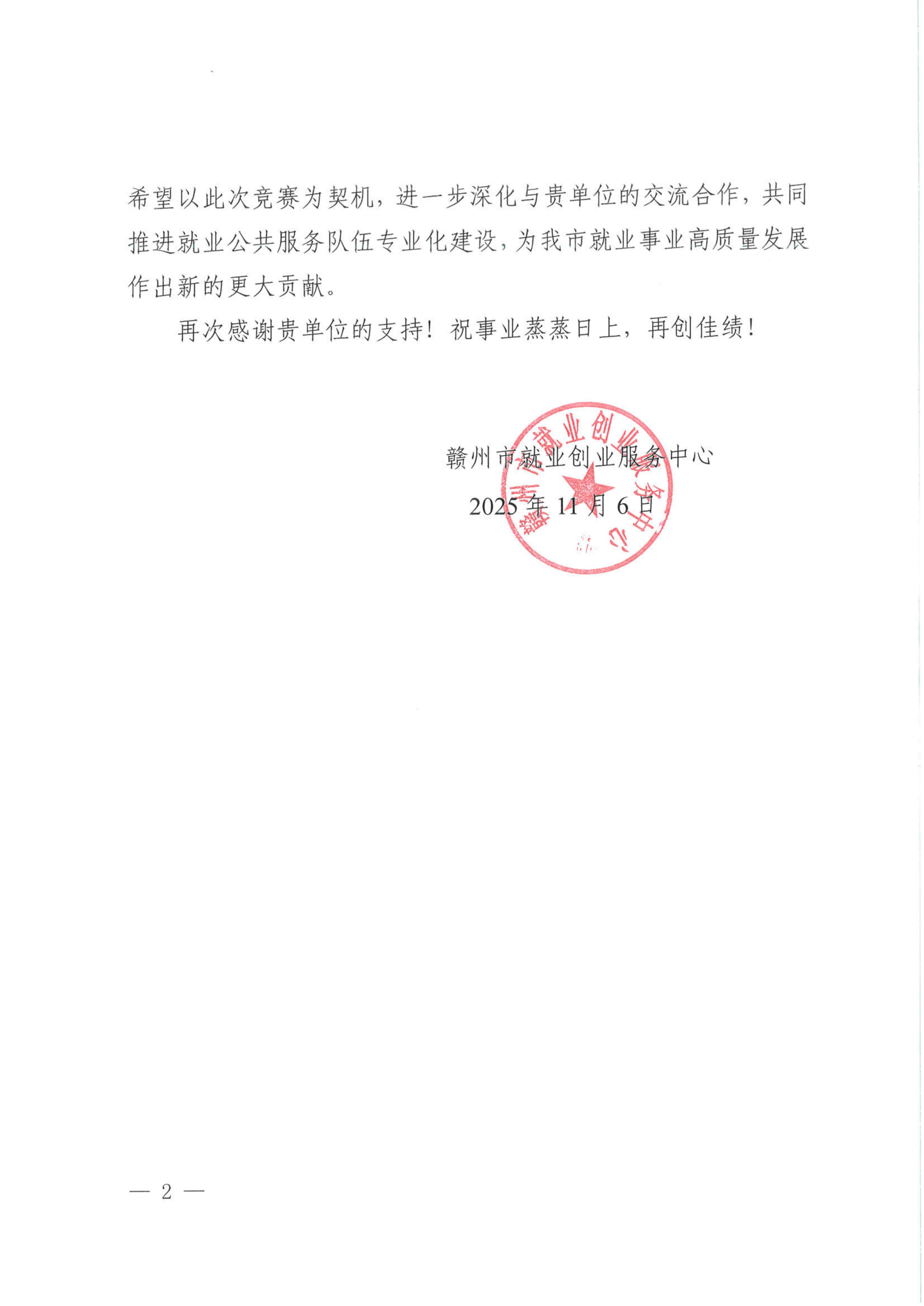 11月6日,赣州市就业创业服务中心专门向学校发来感谢信,对卢玉婷同志在竞赛中的出色表现给予高度评价,赞其为赣州代表队取得佳绩作出重要贡献。信中同时感谢我校长期以来对人才队伍建设的重视和培养,为全市公共就业服务系统输送了大批优秀骨干力量,为推动区域就业创业工作高质量发展提供了坚实支撑。