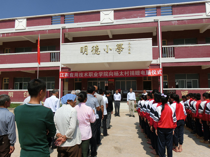 10月12日,暖阳清风,秋高气爽,江西应用技术职业学院向杨太村捐赠电脑仪式在杨太小学举行,学院领导、杨村镇领导和村民、小学代表参加,整个捐赠仪式前后十多分钟,隆重而简单。