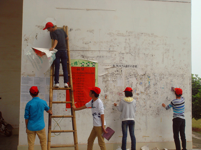 趁中午休息时间,全院学生积极行动起来,对教室、宿舍及周边环境卫生进行了彻底的清扫,各系(部)学工管理人员和学院学工督查组成了专门的检查组进行了检查。院学生会还专门组织了100余名青年志愿者对学院办公楼及校园公共区域进行了清扫,并在校园内开展了“牛皮癣”广告专项清理活动,对教学楼、宣传栏等处的“牛皮癣”广告用砂纸进行了彻底的清理。负责此项活动的学生会副主席邱瑞欢同学说“我们想通过这种方式来表达我们对学院的热爱和感激,同时以这种朴素的方式喜迎国庆佳节”。