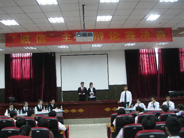 经过前六轮的初赛和半决赛,基础部代表队和机电系代表队一路过关斩将,进入了激烈而又精彩的总决赛,双方的观点分别是“助学贷款是诚信优先”和“助学贷款是制度优先”。经过立论陈词、盘问攻辩、自由辩论、总结陈辞和回答观众提问五个环节,双方针锋相对,攻守兼备,辩手们各个伶牙俐齿、妙语连珠,一次又一次地把赛场气氛推向高潮。经过一番唇枪舌战,正方基础部代表队以3 :2的微弱优势战胜反方,获得本次比赛的桂冠。