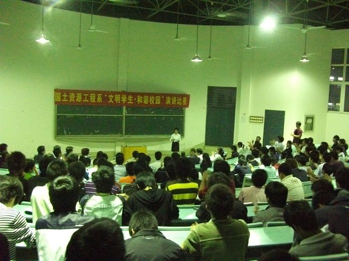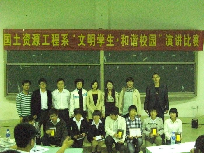 3月31日晚,国土资源工程系在C2栋阶梯教室举行了“文明学生·和谐校园”演讲比赛,系书记张武宏等9名老师担任此次比赛评委。